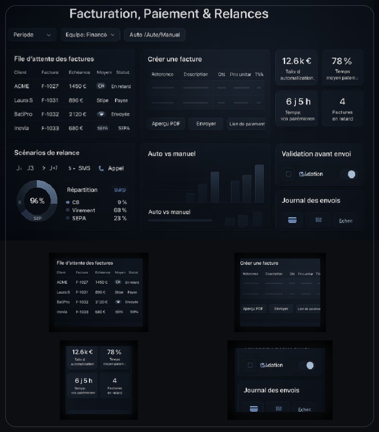 Des factures qui partent à l'heure, paiements suivis sans effort.